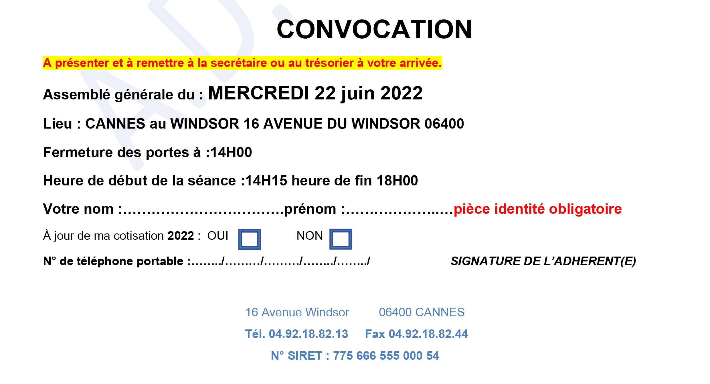 L’assemblée Générale de l’ADOSOM avec l'élection du conseil d’administration aura lieu au WINDSOR à Cannes le 22 JUIN 2022 de 14h15 à 18h.